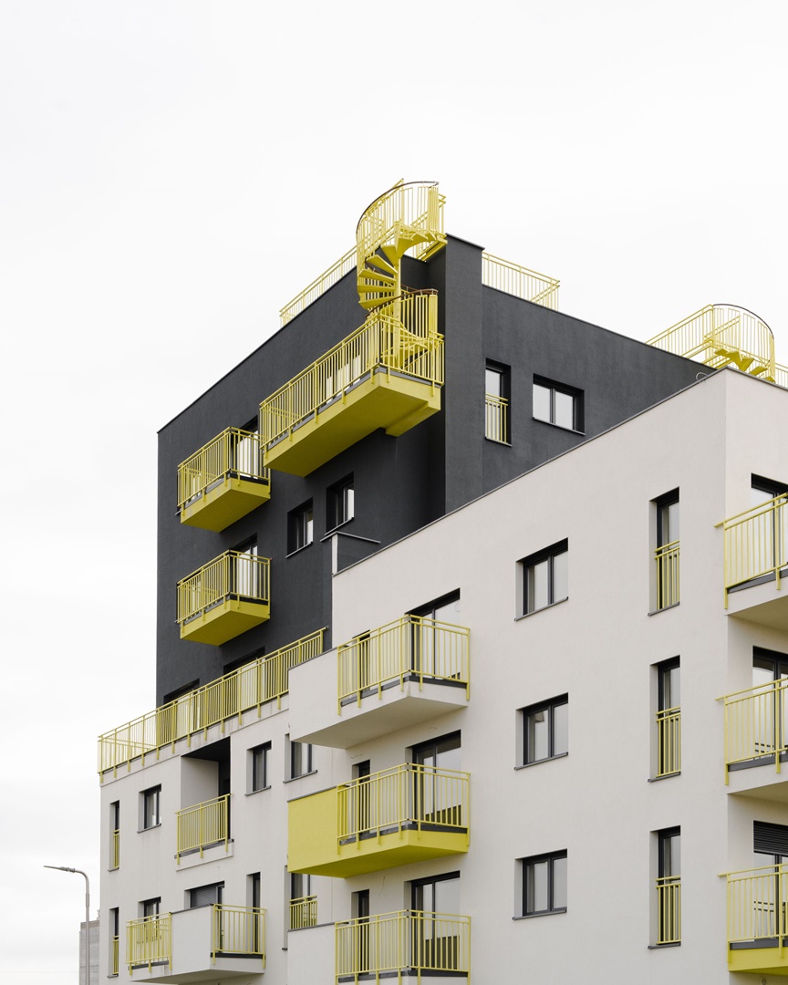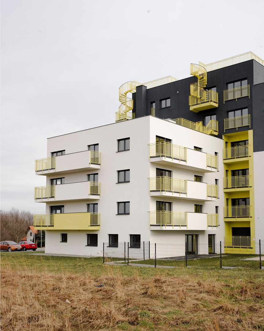 Projekt budynku mieszkalnego wielorodzinnego składającego się z trzech odrębnych klatek. W budynku zaprojektowano łącznie 41 mieszkań o zróżnicowanej powierzchni: od 28m2 do 90 m2. Zaprojektowano budynek na planie litery „L” o wymiarach 28,5m x 34,2m. Podstawowe wykończenie elewacji w kolorze białym. Kolorem żółtym zaakcentowano fragmenty elewacji, balustrady oraz zewnętrzne schody spiralne prowadzące na tarasy na dachu.